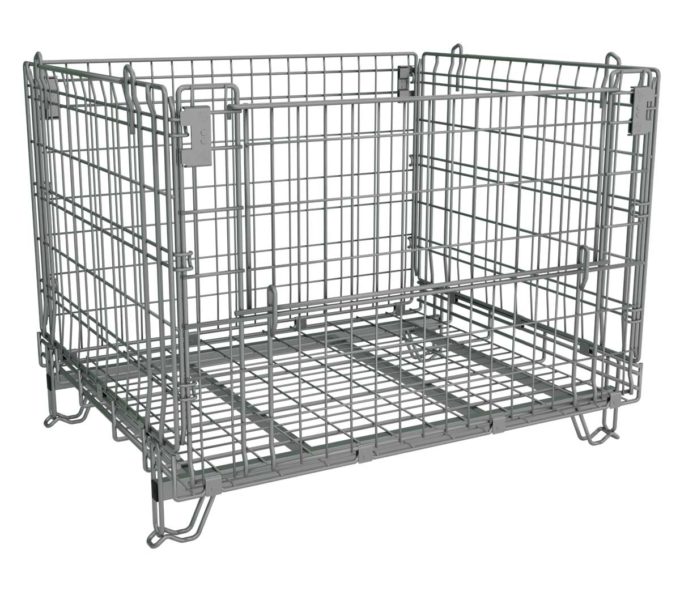 Contenitori in filo metallico e tubolare in acciaio zincato, richiudibili e con la possibilità di sovrapporli sia da chiusi che da aperti.