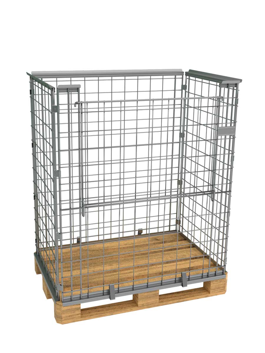 La struttura perimetrale è realizzata in rete metallica zincata elettroliticamente e viene agganciata al pallet in legno con molle metalliche e permette la sovrapposizione su più livelli. Quando non in uso è possibile ripiegarli in modo da ottimizzare lo spazio in magazzino o sui camion.